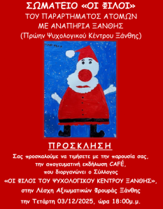 Το Σωματείο «Οι Φίλοι» του Παραρτήματος Ατόμων με Αναπηρία Ξάνθης (πρώην Ψυχολογικό Κέντρο Ξάνθης) προσκαλεί το κοινό σε απογευματινή εκδήλωση τύπου CAFE, με στόχο τη στήριξη και ενίσχυση των δράσεών του.