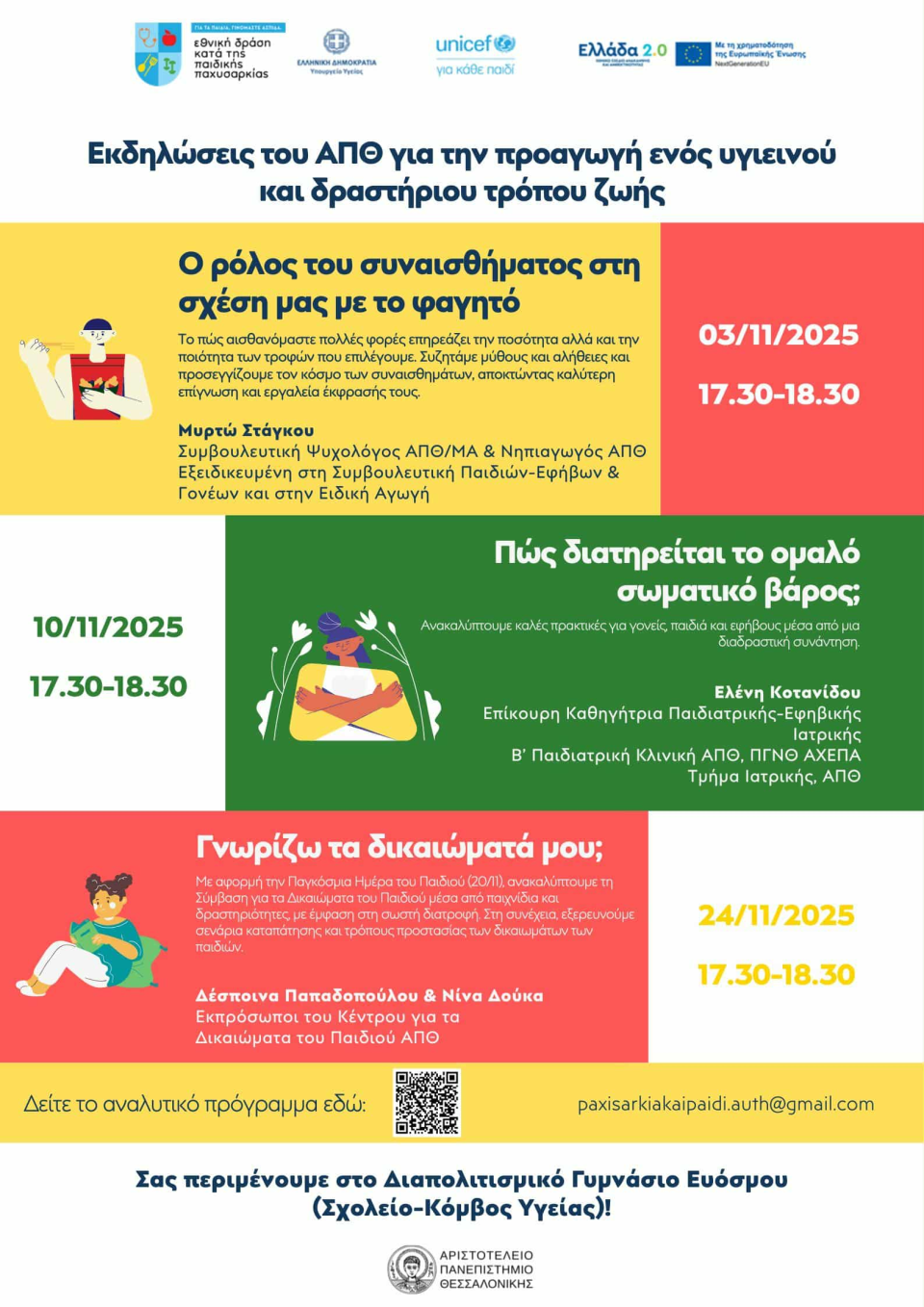 Η σχέση συναισθήματος και διατροφής, η οποία αποτελεί καθοριστικό παράγοντα για τη σωματική και ψυχική ευεξία των παιδιών και των εφήβων, τίθεται στο επίκεντρο της ενημερωτικής εκδήλωσης που διοργανώνει το Αριστοτέλειο Πανεπιστήμιο Θεσσαλονίκης, τη Δευτέρα 3 Νοεμβρίου στις 17:30 στο Διαπολιτισμικό Γυμνάσιο Ευόσμου (οδός Αγίου Αθανασίου 36), το οποίο αποτελεί «Σχολείο-Κόμβο Υγείας» στη Δυτική Θεσσαλονίκη, στο πλαίσιο της Εθνικής Δράσης κατά της Παιδικής Παχυσαρκίας.