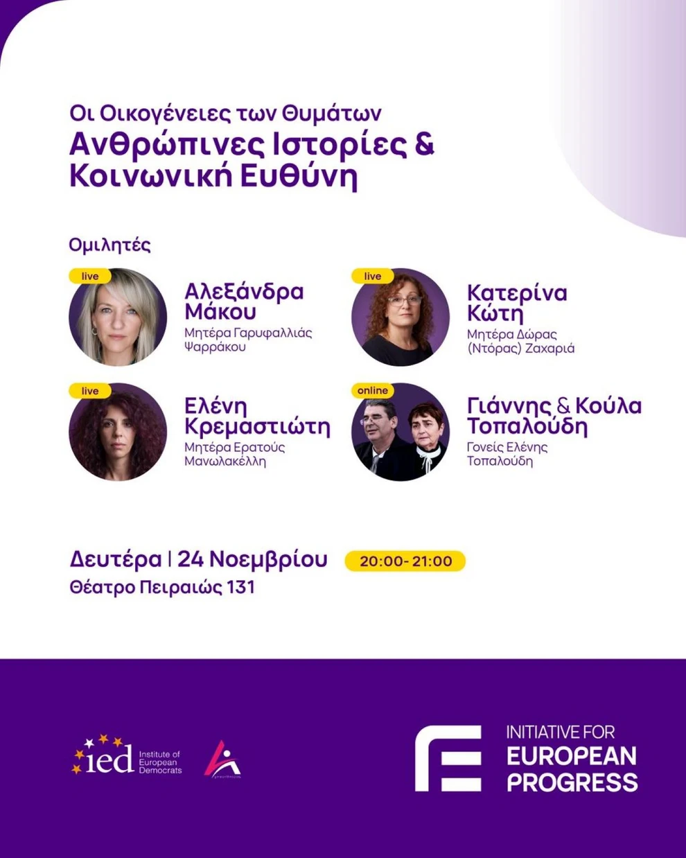 Η πρωτοβουλία για την ευρωπαϊκή πρόοδο, σε συνεργασία με το Ίδρυμα Ευρωπαίων Δημοκρατών και τον οργανισμό «Γίνε Άνθρωπος», προχωρούν σε μία εκδήλωση, τη Δευτέρα 24 Νοεμβρίου στο Θέατρο Πειραιώς 131.