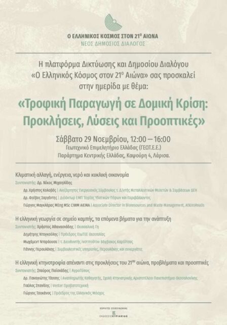 Προκλήσεις, Λύσεις και Προοπτικές». Η εκδήλωση θα γίνει το Σάββατο 29 Νοεμβρίου, από τις 12:00 έως τις 16:00, στο Παράρτημα Κεντρικής Ελλάδας του ΓΕΩΤ.Ε.Ε. στη Λάρισα (Καψούρη 4) και στοχεύει να αναδείξει τα χρόνια προβλήματα του πρωτογενούς τομέα, φέρνοντας στο ίδιο τραπέζι επιστήμονες, παραγωγούς και φορείς.