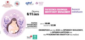 Με αφορμή τον εορτασμό της Παγκόσμιας Εβδομάδας Μητρικού Θηλασμού, ο Δήμος Καλαμαριάς, σε συνεργασία με την 4η Υγειονομική Περιφέρεια Μακεδονίας–Θράκης και το Κέντρο Υγείας 25ης Μαρτίου διοργανώνει ανοιχτή ενημερωτική εκδήλωση την Πέμπτη 6 Νοεμβρίου 2025, από τις 10:00 έως 12:30, στην Πλατεία Προσφυγικού Ελληνισμού.
