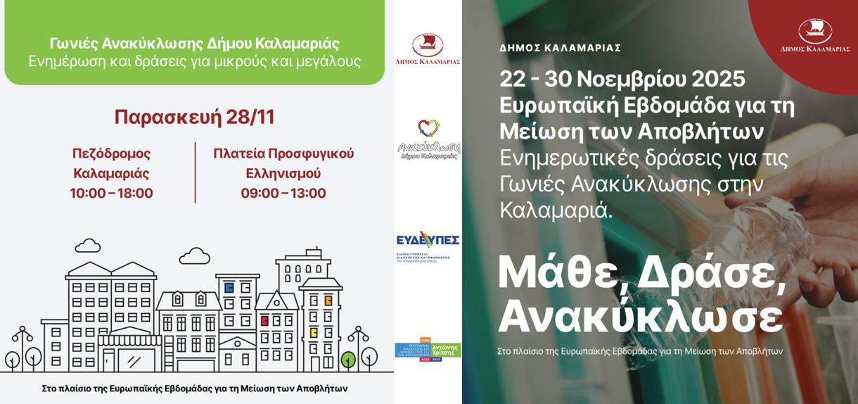 Ο Δήμος Καλαμαριάς συμμετέχει ενεργά στην Ευρωπαϊκή Εβδομάδα Μείωσης Αποβλήτων (22–30 Νοεμβρίου) και διοργανώνει ένα ολοκληρωμένο πρόγραμμα ενημερωτικών, εκπαιδευτικών και βιωματικών δράσεων.