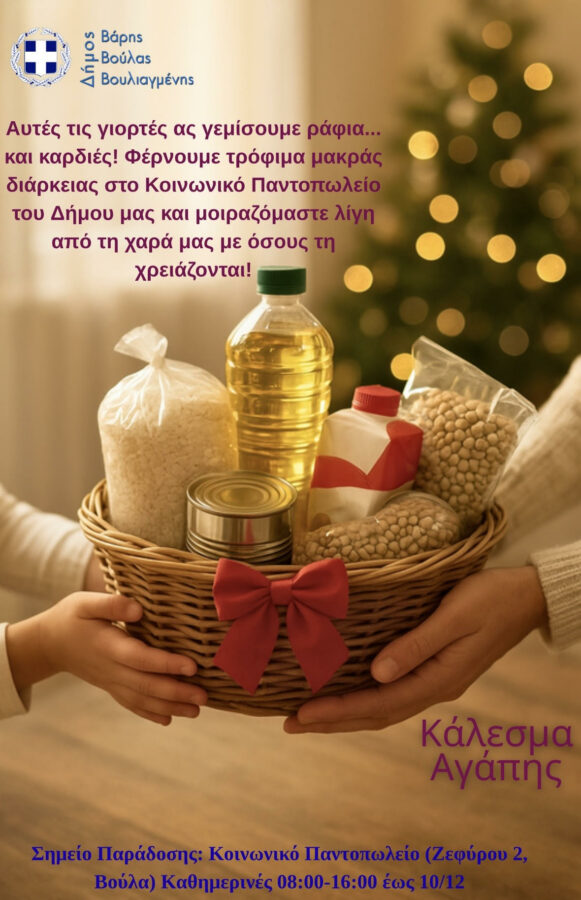 Ο Δήμος Βάρης Βούλας Βουλιαγμένης ξεκινά μια πρωτοβουλία συλλογικής ευθύνης και αγάπης, καλώντας όλους — πολίτες και επιχειρήσεις — να σταθούν δίπλα σε όσους το έχουν πραγματικά ανάγκη.