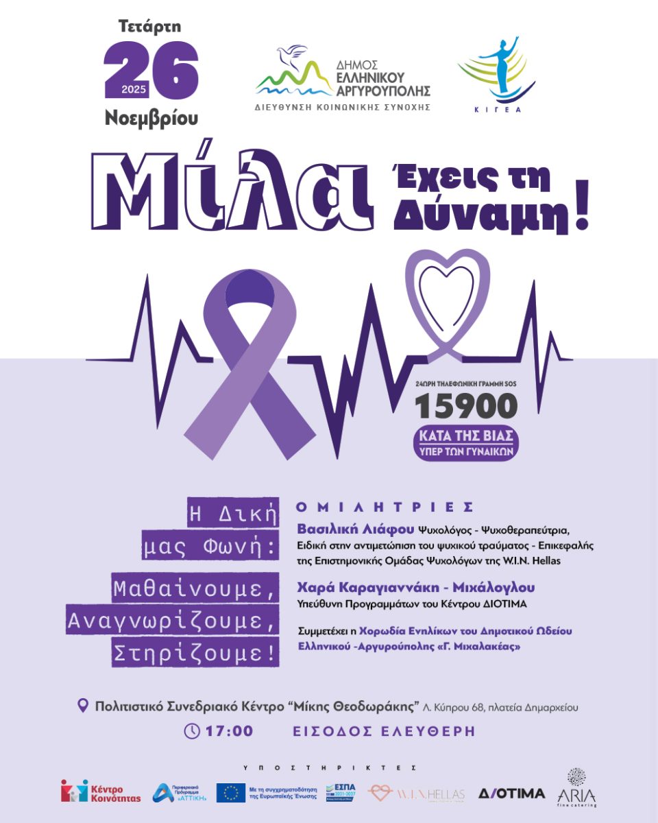 Με αφορμή την Παγκόσμια Ημέρα Εξάλειψης της Βίας κατά των Γυναικών, ο Δήμος Ελληνικού – Αργυρούπολης, μέσω της Διεύθυνσης Κοινωνικής Συνοχής και σε συνεργασία με την Κίνηση Γυναικών Ελληνικού – Αργυρούπολης (ΚΙ.Γ.Ε.Α.), διοργανώνει μια ακόμα σημαντική εκδήλωση ενημέρωσης, ευαισθητοποίησης και ενδυνάμωσης των γυναικών.