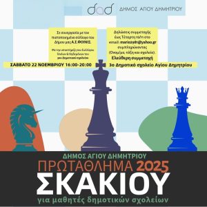 Ο Δήμος Αγίου Δημητρίου προκηρύσσει το Μαθητικό Πρωτάθλημα Σκάκι 2025, με ελεύθερη συμμετοχή για μαθητές Δημοτικών Σχολείων.