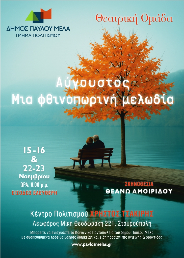 Ο Δήμαρχος Παύλου Μελά, Δημήτρης Ασλανίδης και η Εντεταλμένη Δημοτική Σύμβουλος στον Πολιτισμό, Αδαμαντία Αγκούτογλου σας προσκαλούν στη βραβευμένη παραγωγή της Δημοτικής Θεατρικής Ομάδας, με τίτλο «Αύγουστος – Μια φθινοπωρινή μελωδία», που θα παρουσιαστεί στο Δημοτικό Θέατρο του Κέντρου Πολιτισμού Χρήστος Τσακίρης, Λεωφόρος Μίκη Θεοδωράκη 221 (πρώην Λαγκαδά), Σταυρούπολη.