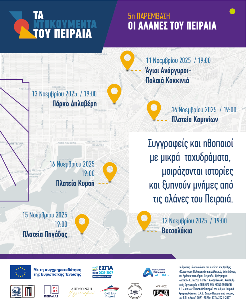 Οι αλάνες του Πειραιά ζωντανεύουν ξανά, μετατρέποντας τις γειτονιές της πόλης, από τις 11 έως και τις 16 Νοεμβρίου, στις 19:00, σε σκηνές τέχνης, μνήμης και παιχνιδιού, φιλοξενώντας την 5η καλλιτεχνική παρέμβαση, στο πλαίσιο του νέου φεστιβάλ «Τα Ντοκουμέντα του Πειραιά».