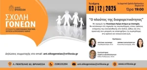 Αφιερωμένη στον «πλούτο της διαφορετικότητας» είναι η προσεχής συνάντηση της Σχολής Γονέων του Δήμου Βριλησσίων που θα πραγματοποιηθεί την Τετάρτη 03/12/2025 και ώρα 19:00 στο 5ο Δημοτικό Σχολείο Βριλησσίων (Αλφειού 62).