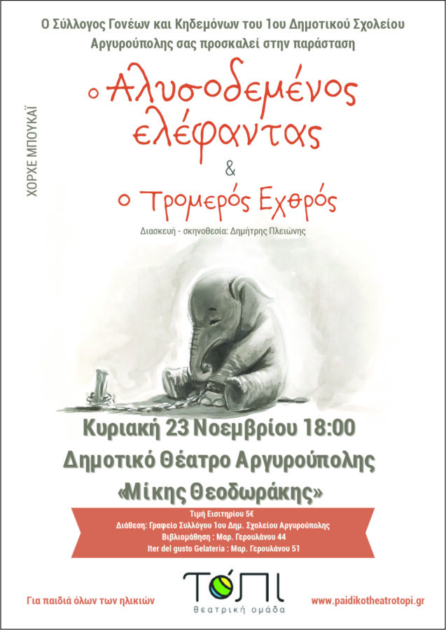 «Ο Αλυσοδεμένος Ελέφαντας & Ο Τρομερός Εχθρός» την Κυριακή 23 Νοεμβρίου στις 18:00, στο Δημοτικό Θέατρο Αργυρούπολης «Μίκης Θεοδωράκης».