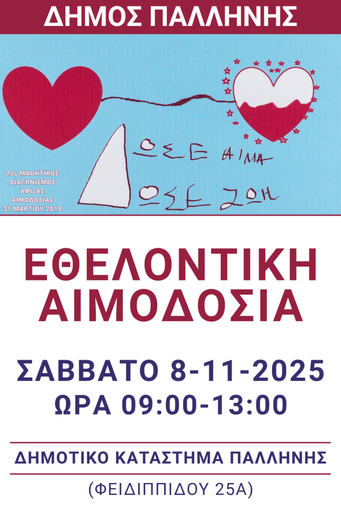 Ο Δήμος Παλλήνης προσκαλεί όλους τους δημότες και κατοίκους της πόλης να συμμετάσχουν στη δράση Εθελοντικής Αιμοδοσίας, που θα πραγματοποιηθεί το Σάββατο 8 Νοεμβρίου 2025, από 09:00 έως 13:00, στο Δημοτικό Κατάστημα Παλλήνης (Φειδιππίδου 25Α, Παλλήνη).