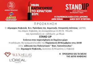 Ο Δήμαρχος Κηφισιάς, Βασίλης Ξυπολυτάς & η Πρόεδρος της Δημοτικής Επιτροπής Ισότητας (ΔΕΠΙΣ) του Δήμου Κηφισιάς, Αντιδήμαρχος Κοινωνικών Υπηρεσιών, Μαρία Κεφαλά – Σαλματάνη σε συνεργασία με τη WIN HELLAS σας προσκαλούν σε εκδήλωση με θέμα: STAND UP Ενάντια στην παρενόχληση σε δημόσιο χώρο
