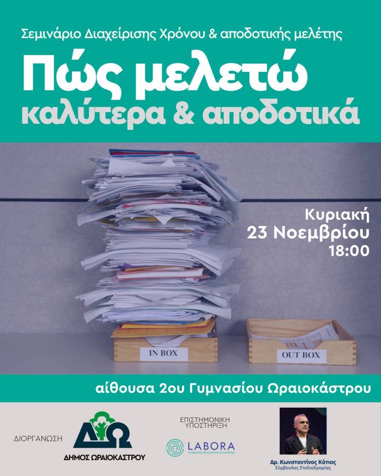 Ο Δήμος Ωραιοκάστρου, η Αντιδημαρχία Παιδείας, Προσχολικής Αγωγής και Δια Βίου Μάθησης, διοργανώνει σε συνεργασία με την επιστημονική ομάδα της «LABORA – Σύμβουλοι Εκπαίδευσης» πρωτοποριακό σεμινάριο διαχείρισης χρόνου με τίτλο: «Πώς μελετάω καλύτερα και πιο αποδοτικά».
