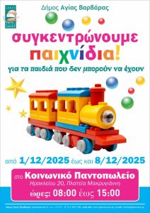 Τα παιχνίδια που θα συγκεντρωθούν, θα διανεμηθούν από το Κοινωνικό Παντοπωλείο του Δήμου στις οικογένειες των παιδιών που τα χρειάζονται.