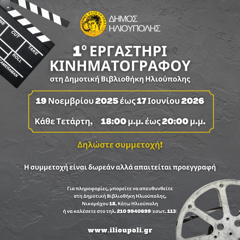 Ο Δήμος Ηλιούπολης διοργανώνει εργαστήριο για ερασιτέχνες άνω των 18 ετών, που ενδιαφέρονται για την τέχνη και την τεχνική του κινηματογράφου και της τηλεόρασης.