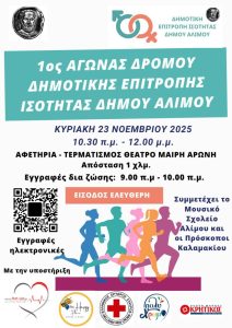 Με αφορμή την Παγκόσμια Ημέρα για την Εξάλειψη της Βίας κατά των Γυναικών στις 25 Νοεμβρίου, η Επιτροπή Ισότητας του Δήμου Αλίμου (Δ.ΕΠ.ΙΣ.) διοργανώνει την Κυριακή 23 Νοεμβρίου 2025 και ώρα 10.30 π.μ. συμβολικό αγώνα δρόμου 1 χιλιομέτρου, με τίτλο: «Τρέχουμε για την Εξάλειψη της Βίας κατά των Γυναικών».