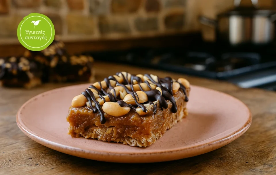 - Βήμα 3: Απλώνουμε το μείγμα βρώμης σε σκεύος στρωμένο με λαδόκολλα, συνεχίζουμε με την υπόλοιπη καραμέλα, προσθέτουμε τα φιστίκια και βάζουμε στην κατάψυξη για 1,5 ώρα.