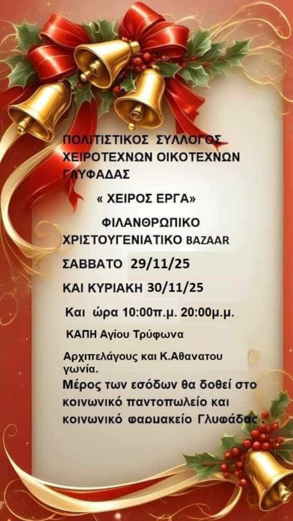 Ο Πολιτιστικός Σύλλογος Χειροτεχνών Οικοτεχνών Γλυφάδας «Χειρός Έργα» και η δραστήρια Πρόεδρός του Καίτη Μανουσάκη – Πρεβόλη, σας καλούν σε ένα διήμερο αγάπης με φιλανθρωπικό σκοπό.