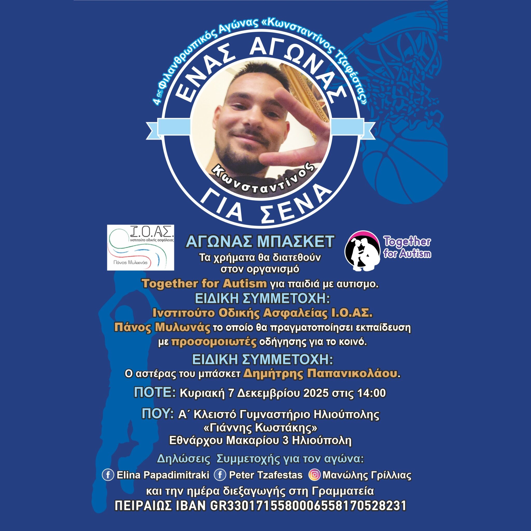 Ενημερώνουμε τους Δημότες και Κατοίκους της πόλης ότι την Κυριακή 7 Δεκεμβρίου 2025 στις 14:00 θα διεξαχθεί ο 4ος Φιλανθρωπικός Αγώνας «Κωνσταντίνος Τζαφέστας» με τίτλο «Ένας Αγώνας για Σένα» στη μνήμη του αδικοχαμένου Ηλιουπολίτη Κωνσταντίνου σε νεαρή ηλικία.