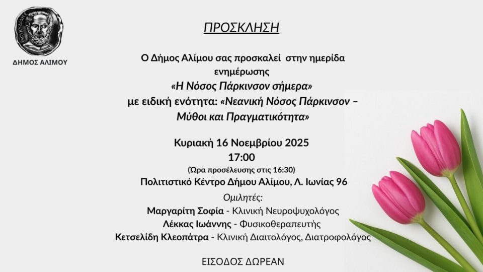 Η Ελένη Καλλονιάτη, μια νέα γυναίκα που ζει στον Άλιμο και πάσχει από Νεανική νόσο Πάρκινσον, πρότεινε στον Δήμαρχο Αλίμου Ανδρέα Κονδύλη μια δημόσια ενημέρωση για τη νόσο, με στόχο την ενδυνάμωση των πασχόντων μέσα από την ανταλλαγή εμπειριών και τρόπων «για το πώς συνεχίζεις, για το πώς βρίσκεις χαρά μέσα στη δυσκολία».