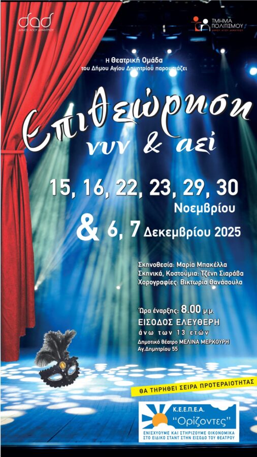 “Επιθεώρηση Νυν & Αεί” είναι η νέα παράσταση της Θεατρικής Ομάδας του Δήμου Αγίου Δημητρίου σε σκηνοθεσία της Μαρίας Μπακέλλα, σκηνικά – κοστούμια της Τζένης Σιαβάρα και χορογραφίες της Βικτωρίας Θανασούλα, που θα παρουσιαστεί στο Δημοτικό Θέατρο Μελίνα Μερκούρη (στο Δημαρχείο) στις 15 & 16, 22 & 23, 29 & 30 Νοεμβρίου 2025, στις 20:00.