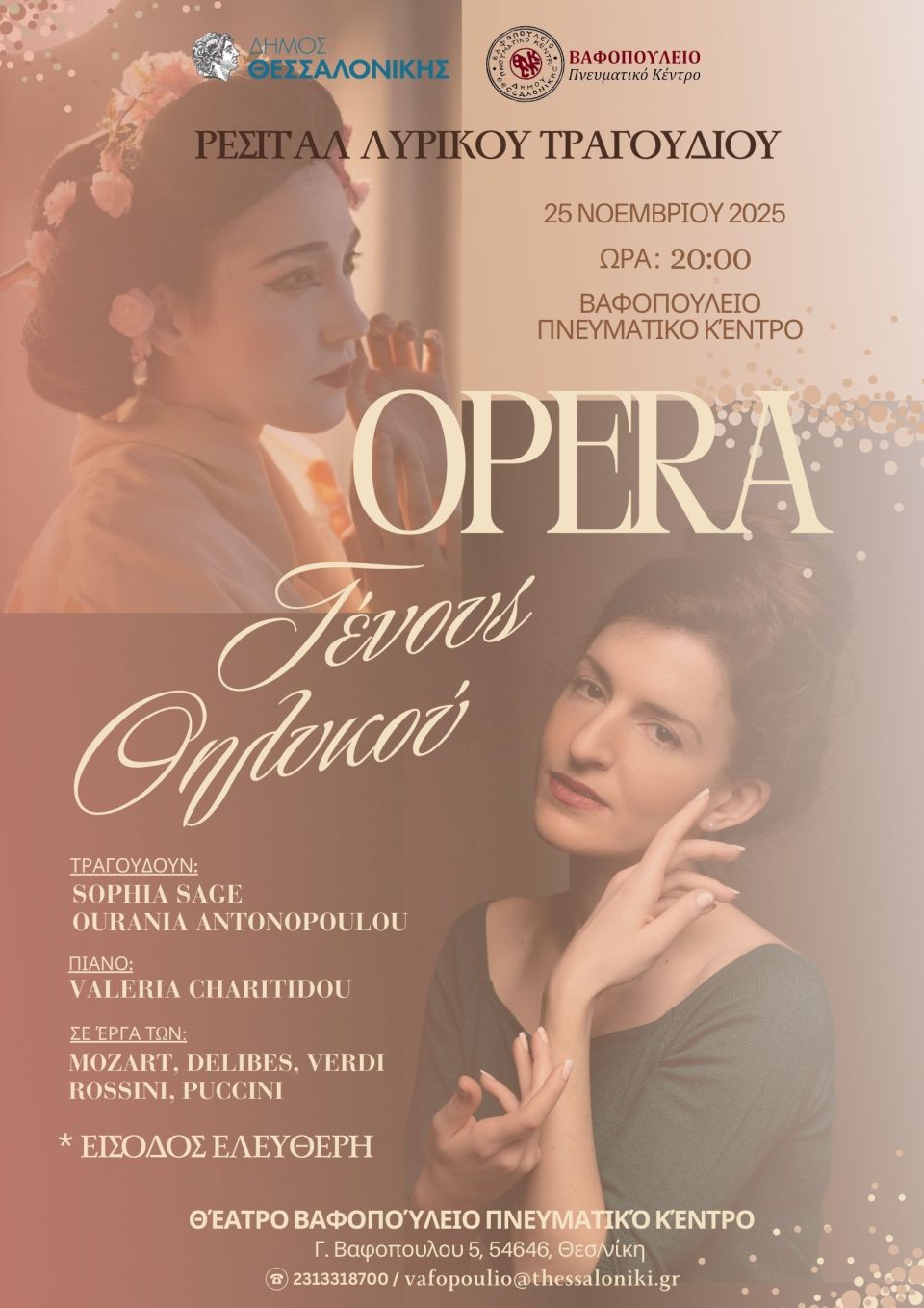 Το Βαφοπούλειο Πνευματικό Κέντρο διοργανώνει ρεσιτάλ λυρικού τραγουδιού με τίτλο «OPERA ΓΕΝΟΥΣ ΘΗΛΥΚΟΥ», την Τρίτη 25 Νοεμβρίου 2025, με τις Sophia Sage (Σοφία Χατζηρήγα, σοπράνο), Ουρανία Αντωνοπούλου (σοπράνο) και Βαλέρια Χαριτίδου (πιάνο).
