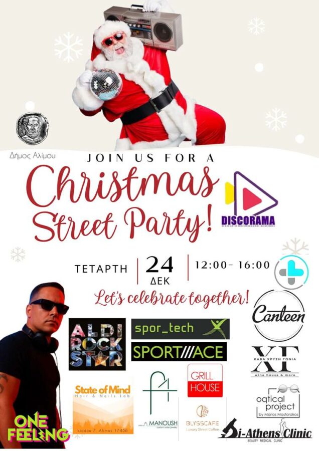 Tα καταστήματα Αldi Rock Star, State of Mind, Fatto a Manoush Custom order jewelry, Canteen, Grill House, Φαρμακείο Ντίσιου, Optical Project, spor_tech, Κάβα Χρυσή Γωνία, BlyssCafe, Sportace, Di Athens CLINIC μας καλούν σε ένα μοναδικό Christmnas Street Party, με ελληνικές και ξένες επιτυχίες των 80s-90s που όλοι αγαπήσαμε και χορέψαμε!
