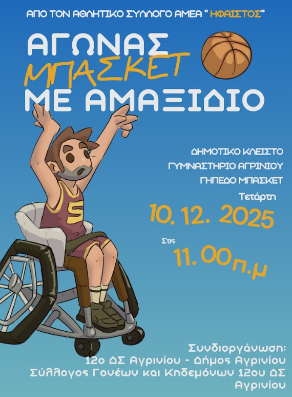 Το 12ο Δημοτικό Σχολείο Αγρινίου, στο πλαίσιο των δράσεων για την Παγκόσμια Ημέρα Ατόμων με Αναπηρία και σε συνεργασία με τον Δήμο Αγρινίου και τον Σύλλογο Γονέων και Κηδεμόνων του 12ου Δ.Σ. Αγρινίου, διοργανώνει αγώνα μπάσκετ με αμαξίδιο.