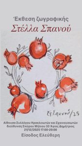 ΚεντρικήΚοινωνικάΑτομική έκθεση ζωγραφικής της Στέλλας Σπανού by xristiana21 Δεκεμβρίου 202521 Δεκεμβρίου 202505 Share00 21/12/2025… Ατομική έκθεση ζωγραφικής Κυριακή 21 Δεκεμβρίου 17:00 με 20:00 στην Αίθουσα του Συλλόγου Ηρακλειωτών και Σχοινουσιωτών που βρίσκεται Σπύρου Μήλιου 33, στον Άγιο Δημήτριο με θέμα ”Το Ρόδι ” για Καλή Τύχη και Καλή Χρονιά!