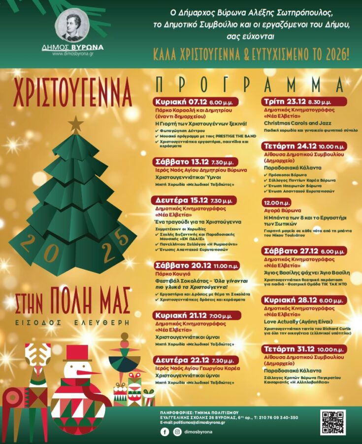 Ο Δήμος Βύρωνα, στο πλαίσιο των εορταστικών εκδηλώσεων «Χριστούγεννα στην Πόλη μας», διοργανώνει την Τετάρτη 24 Δεκεμβρίου 2025, στις 12:00, στην Αγορά του Βύρωνα, μια γιορτινή συναυλία για μικρούς και μεγάλους.