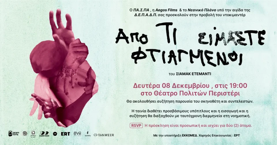 Ο Δήμος Περιστερίου, υπό την αιγίδα του οποίου τελεί η εκδήλωση, ενημερώνει ότι ο Πανελλήνιος Σύλλογος Παραπληγικών (ΠΑ.Σ.ΠΑ.), σε συνεργασία με τη Δημοτική Επιχείρηση Πολιτιστικής Ανάπτυξης Δήμου Περιστερίου (ΔΕΠΑΔΠ), διοργανώνει την ειδική προβολή του ντοκιμαντέρ «Από Τι Είμαστε Φτιαγμένοι» του σκηνοθέτη Σιαμάκ Ετεμάντι, τη Δευτέρα 8 Δεκεμβρίου 2025, στις 19:00, στο Θέατρο Πολιτών.