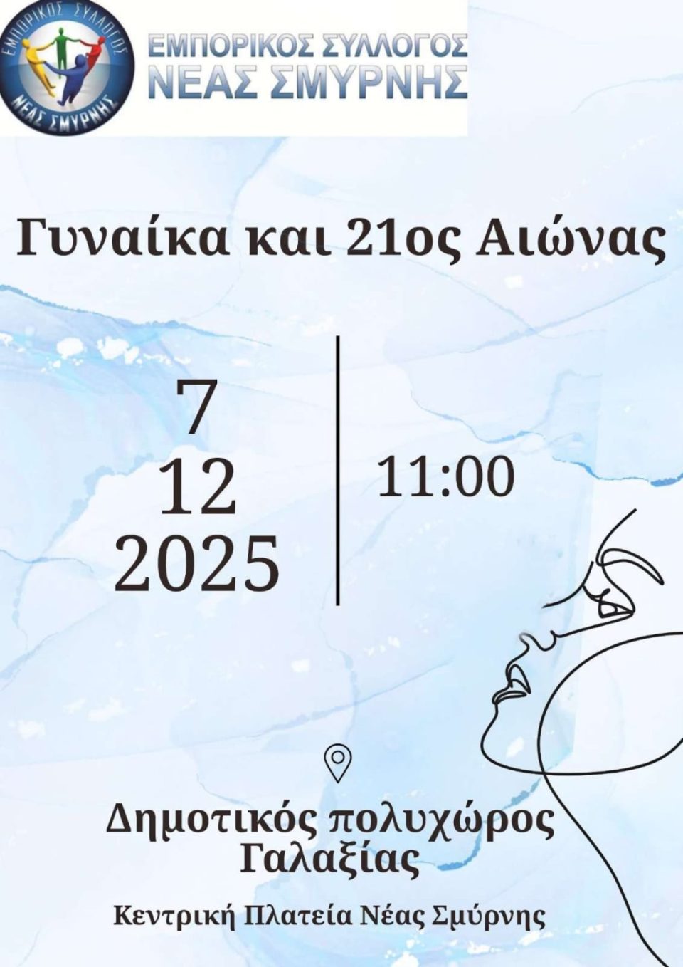 Εκδήλωση με θέμα «Γυναίκα και 21ος Αιώνας» διοργανώνει ο Εμπορικός Σύλλογος Νέας Σμύρνης την Κυριακή 7 Δεκεμβρίου, ώρα 11:00 στον Δημοτικό Πολυχώρο «Γαλαξίας».