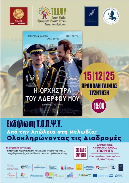 Στην κινηματογραφική προβολή της ταινίας «Η Ορχήστρα του Αδερφού μου» του Emmanuel Courcol προσκαλεί η η Τοπική Ομάδα Προαγωγής Ψυχικής Υγείας του Δήμου Νέας Σμύρνης τη Δευτέρα 15 Δεκεμβρίου, ώρα 15:00 στον Δημοτικό Κινηματογράφο Σπόρτινγκ (Κων/νου Παλαιολόγου 18).