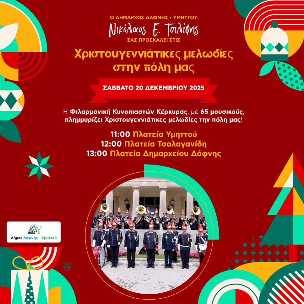 Οι 65 μουσικοί της Φιλαρμονικής θα πλημμυρίσουν τους δρόμους της Δάφνης και του Υμηττού με εορταστική μουσική, παίζοντας ζωντανά σε γειτονιές και πλατείες, το Σάββατο 20 Δεκεμβρίου και την Κυριακή 21 Δεκεμβρίου από τις 11:00 π.μ.
