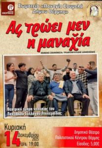 Η πρώτη αφορά τη θεατρική παράσταση «Ας τρώει μεν η μανασία» η οποία θα πραγματοποιηθεί την Κυριακή 14 Δεκεμβρίου και ώρα 19:00 στο Πολιτιστικό Κέντρο Θέρμης.