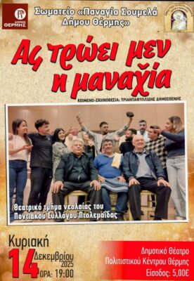 Επίσης, την Τετάρτη 17 Δεκεμβρίου και ώρα 20:00 στο εστιατόριο Θερμαΐς το σωματείο “Παναγία Σουμελά Δήμου Θέρμης” διοργανώνει ποντιακή φιλανθρωπική βραδιά με σκοπό να ενισχύσει τις φιλανθρωπικές δράσεις του σωματείου.