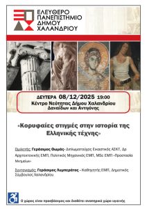 Τη Δευτέρα 08/12 και ώρα 19:00 στο Κέντρο Νεότητας (Δαναΐδων & Αντιγόνης) το Ελεύθερο Πανεπιστήμιο του Δήμου Χαλανδρίου φιλοξενεί την πολύ ενδιαφέρουσα όσο και επίκαιρη εκδήλωση με θέμα: «Κορυφαίες στιγμές στην ιστορία της Ελληνικής τέχνης»