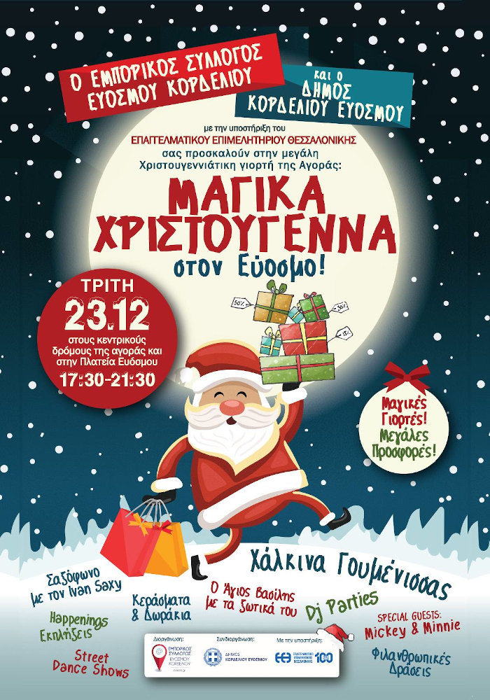 Ο Εμπορικός Σύλλογος Ευόσμου Κορδελιού, σε συνεργασία με τον Δήμο Κορδελιού Ευόσμου και την υποστήριξη του Επαγγελματικού Επιμελητηρίου Θεσσαλονίκης, διοργανώνει μια μεγάλη χριστουγεννιάτικη εκδήλωση που υπόσχεται να μεταμορφώσει το κέντρο της περιοχής.