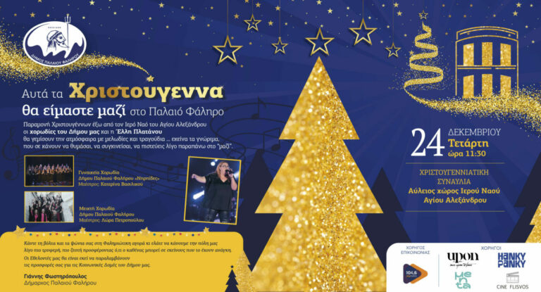 Παραμονή Χριστουγέννων έξω από τον Ιερό Ναό Αγίου Αλεξάνδρου οι Χορωδίες του Δήμου Παλαιού Φαλήρου και η Έλλη Πλατάνου θα γεμίσουν την ατμόσφαιρα με…εκείνα τα γνώριμα, που σε κάνουν να θυμάσαι, να συγκινείσαι, να πιστεύεις λίγο παραπάνω στο ¨μαζί¨. Με σεβασμό και αγάπη, θα ακουστούν κάλαντα και άλλα πολύ γνώριμα ακούσματα που θα ζεστάνουν τις ψυχές μας.