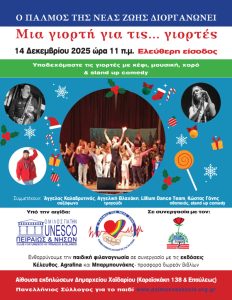 Ο «Παλμός της Νέας Ζωής», σε συνεργασία με τον Δήμο Χαϊδαρίου – και υπό την αιγίδα της Unesco – διοργανώνει Χριστουγεννιάτικη γιορτή για παιδιά, την Κυριακή 14 Δεκεμβρίου, στις 11:00, στην Αίθουσα Εκδηλώσεων του Δημαρχείου Χαϊδαρίου.