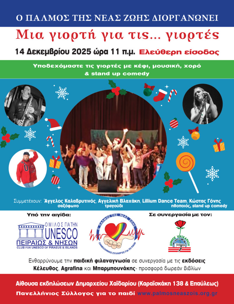Ο «Παλμός της Νέας Ζωής», σε συνεργασία με τον Δήμο Χαϊδαρίου – και υπό την αιγίδα της Unesco – διοργανώνει Χριστουγεννιάτικη γιορτή για παιδιά, την Κυριακή 14 Δεκεμβρίου, στις 11:00, στην Αίθουσα Εκδηλώσεων του Δημαρχείου Χαϊδαρίου.