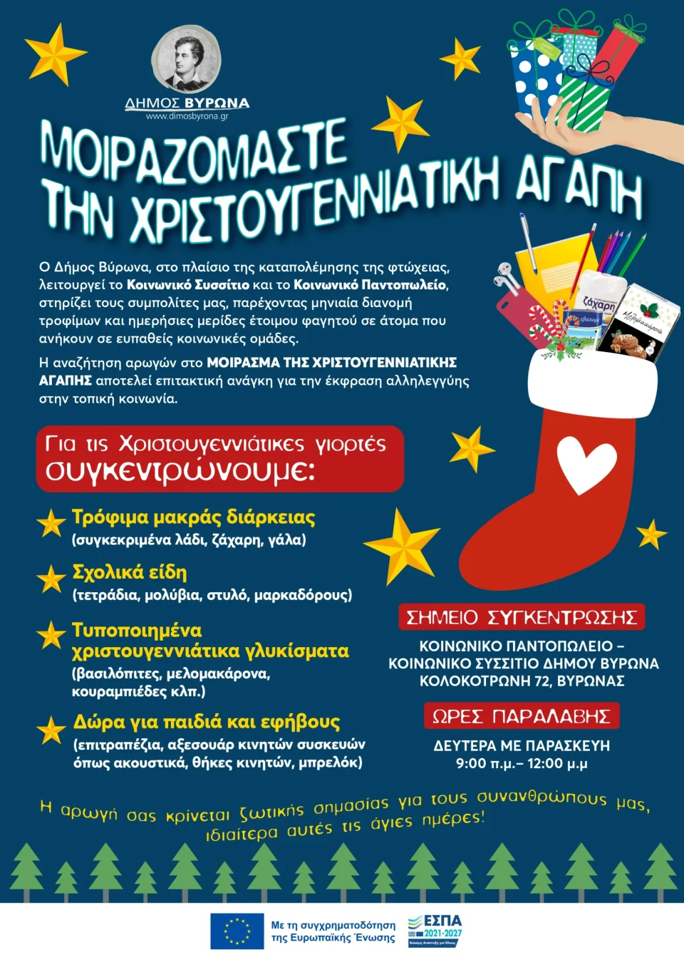 Σημείο Συγκέντρωσης: Κοινωνικό Παντοπωλείο – Κοινωνικό Συσσίτιο Δήμου Βύρωνα (Κολοκοτρώνη 72, Βύρωνας)