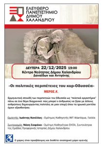 Τη Δευτέρα 22/12 και ώρα 19:00 στο Κέντρο Νεότητας (Δαναΐδων & Αντιγόνης) το Ελεύθερο Πανεπιστήμιο του Δήμου Χαλανδρίου φιλοξενεί το πρώτο μέρος (το 2ο μέρος 12/01) πρόκειται να μιας πολύ ενδιαφέρουσας εκδήλωσης με θέμα: «Οι πολιτικές περιπέτειες του κυρ-Οδυσσέα».