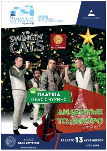 Η αρχή των εορταστικών εκδηλώσεων γίνεται με το άναμμα του Χριστουγεννιάτικου Δέντρου το Σάββατο 13 Δεκεμβρίου, ώρα 20:00 στην Κεντρική Πλατεία κι ένα κεφάτο πάρτυ με τους Swingin’ Cats. Η εκδήλωση συνδιοργανώνεται με την Περιφέρεια Αττικής.