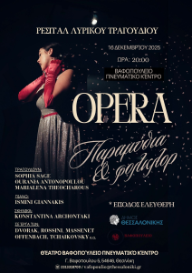 Ο Δήμος Θεσσαλονίκης και το Βαφοπούλειο Πνευματικό Κέντρο διοργανώνουν ένα Ρεσιτάλ Λυρικού Τραγουδιού με τίτλο «Όπερα, Παραμύθια & Φολκλόρ», όπου οι καλλιτέχνιδες Sophia Sage, Ourania Antonopoulou, Marialena Theocharous (τραγούδι) και Ισμήνη Γιαννάκη (πιάνο) θα ερμηνεύσουν έργα των Dvorak, Rossini, Massenet, Offenbach, Tchaikovsky και άλλων.