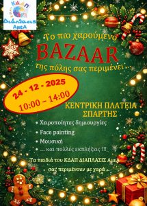 Την 24η Δεκεμβρίου 2025, από τις 10:00 έως τις 14:00, το ΚΔΑΠ ΔΙΑΠΛΑΣΙΣ ΑμεΑ διοργανώνει το χριστουγεννιάτικο bazaar του στην κεντρική πλατεία Σπάρτης.