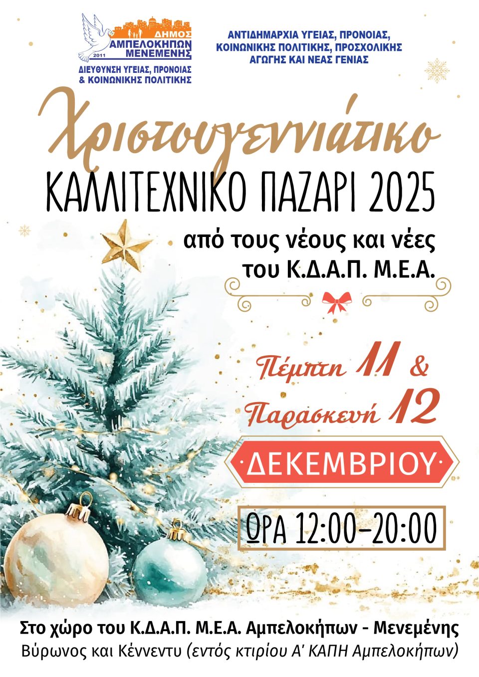 Ο Δήμος Αμπελοκήπων-Μενεμένης και η Αντιδημαρχία Υγείας, Πρόνοιας, Κοινωνικής Πολιτικής, Προσχολικής Αγωγής και Νέας Γενιάς σας προσκαλούν στο Χριστουγεννιάτικο Bazaar του ΚΔΑΠΑμεΑ που θα πραγματοποιηθεί στις 11 και 12 Δεκεμβρίου 2025, στον χώρο της δομής, στο Α΄ ΚΑΠΗ (οδός Βύρωνος με Κένεντυ).
