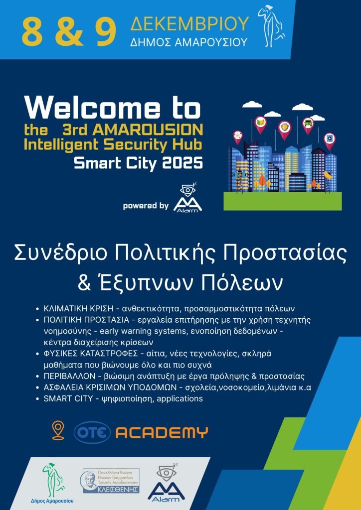 Ο Δήμος Αμαρουσίου, η Ένωση Γενικών Γραμματέων Τοπικής Αυτοδιοίκησης «Κλεισθένης» και η εταιρεία AA-ALARM συνδιοργανώνουν το 3ο Συνέδριο Πολιτικής Προστασίας & Έξυπνων Πόλεων, το οποίο θα πραγματοποιηθεί στις 8 και 9 Δεκεμβρίου 2025 στις εγκαταστάσεις της ΟΤΕAcademy στο Μαρούσι.