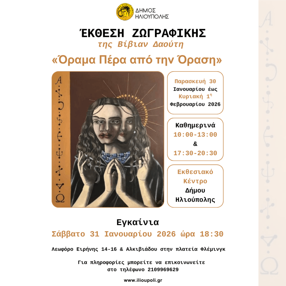O Δήμος Ηλιούπολης έχει την τιμή να σας προσκαλέσει στην Έκθεση Ζωγραφικής της Βίβιαν Δαούτη με τίτλο «Όραμα Πέρα από την Όραση».