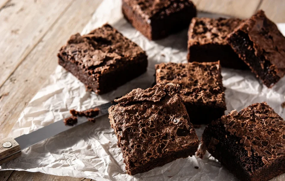 - Προθερμάνετε το φούρνο στους 180 βαθμούς στον αέρα. Βουτυρώστε ένα ταψί και στρώστε τη βάση και όλες τις πλευρές με 2 στρώσεις λαδόκολλα, επεκτείνοντας το χαρτί 2 cm πάνω από τις άκρες του ταψιού.