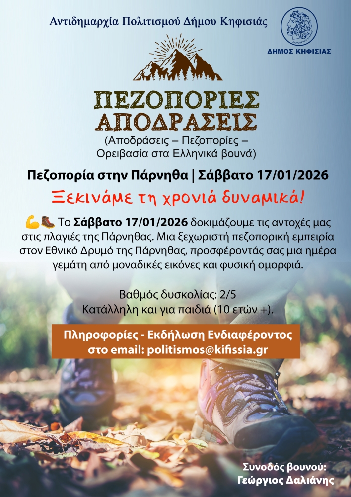Οι πεζοπορίες και αποδράσεις που σχεδίασε και ενέταξε η Αντιδημαρχία Πολιτισμού του Δήμου Κηφισιάς στο πρόγραμμα Μαθημάτων Καλλιτεχνικής Παιδείας για ενήλικες και παιδιά 2025 – 2026  συνεχίζονται δυναμικά και τη νέα χρονιά!